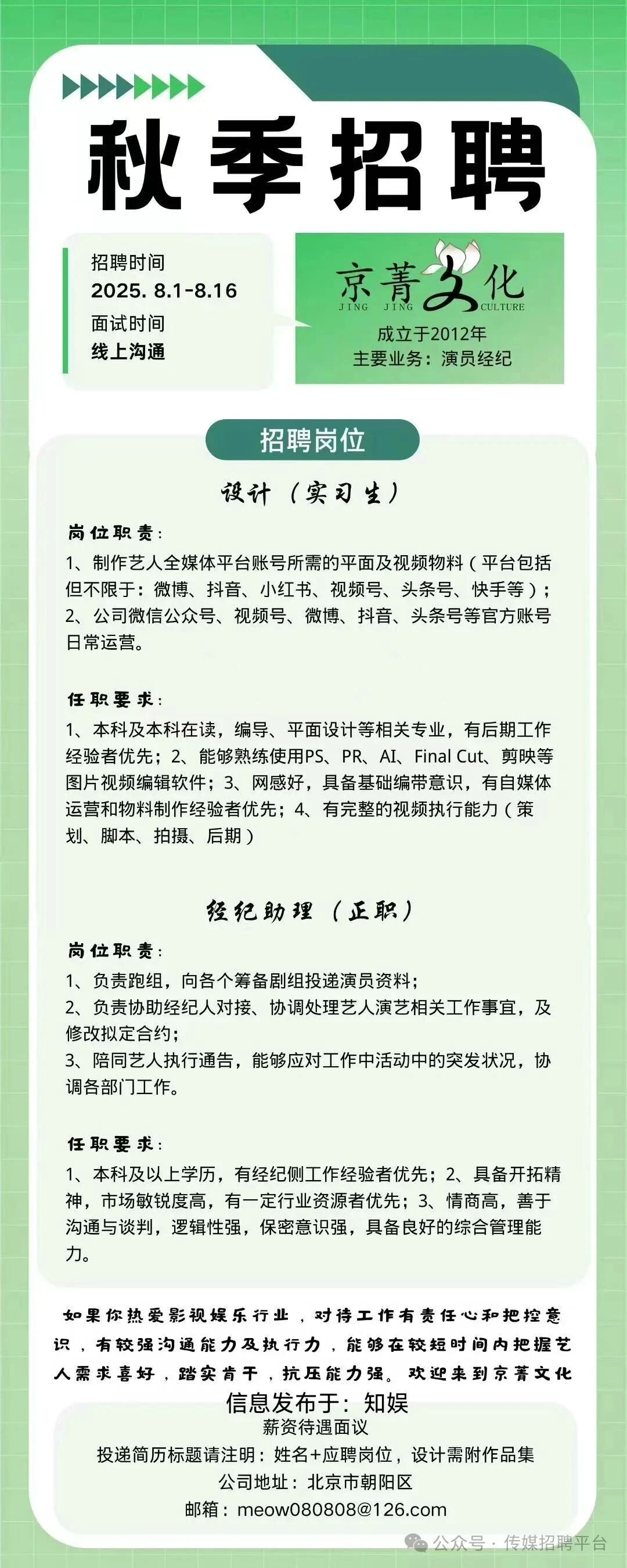 就业指导丨京菁文化招聘经纪助理、设计实习生