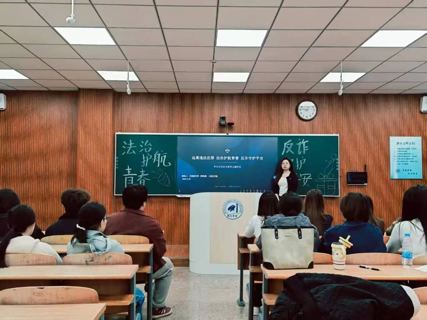 班会现场,各班班长利用专题讲解、案例剖析、分组研讨等丰富形式组织学生学习《大学生违规违法警示案例汇编》普及公民基本权利义务,让法治意识深入人心。结合《中华人民共和国民法典》、《中华人民共和国刑法》、《中华人民共和国反电信网络诈骗法》等法律法规,强调遵纪守法的重要性,明确校园行为的边界。班会尾声,班长们号召全体同学将法治知识融入日常,严格遵守法律法规与校规校纪,自觉抵制违规违法行为,共同守护校园秩序。