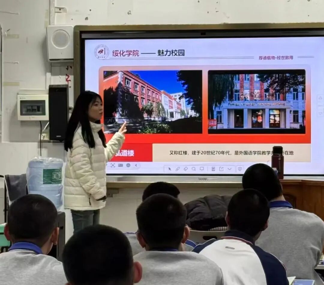 1月3日,于海璐同学回到了梦想起航的地方——“龙江县第二中学”开展宣讲活动。站在熟悉的教室里,她向学弟学妹展示了她眼中的绥院,从图书馆的灯火、实验室的身影到运动场上的活力,丰富的校园生活让学弟学妹们直观领略到大学生活的独特魅力,也加深了大家对千亿球友会的认知。随后,她以亲身经历介绍大学专业与社团生活,并分享高中学习方法与心态调整经验。互动环节中,她耐心解答学弟学妹的疑问。活动的最后,她说:“从他们眼里,我看见了曾经那个憧憬又不安的自己。”