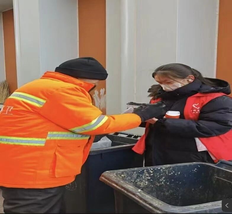 这个假期,渠慧蓉同学开展了一场关于“情暖青城·关爱环卫工人”的志愿服务活动。她对接当地环卫部门,精准了解一线环卫工人的实际需求后,采购了防寒手套、保温水杯等实用物资,更联动本地爱心商户,为辛劳的“城市美容师”们送上热气腾腾的奶茶,用一杯热饮驱散冬日寒意,用一份关怀传递向善力量。同时,她还立足专业所长,用镜头定格精彩瞬间,让更多人可以看见劳动者的风采。